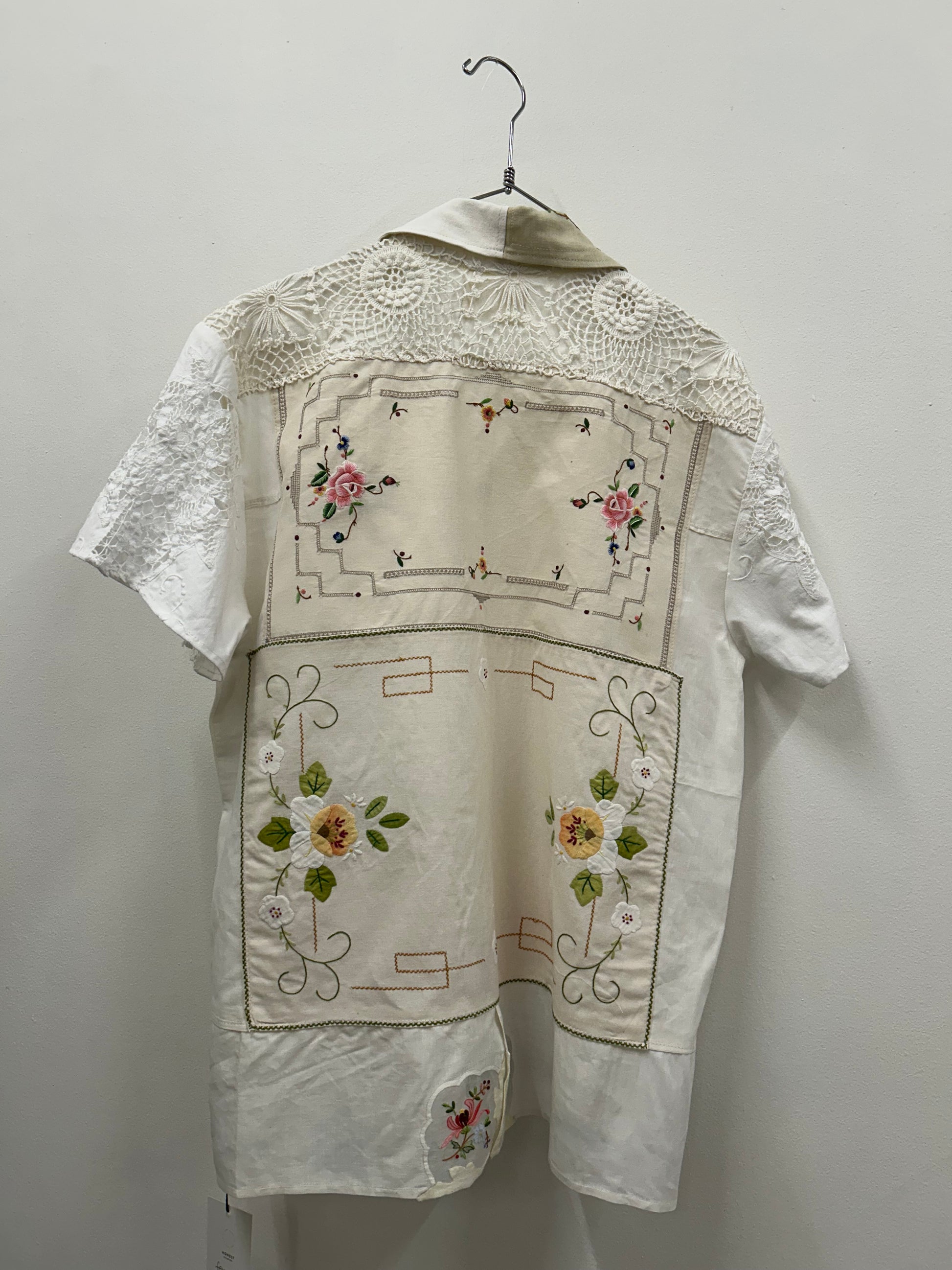 Made from vintage tablecloths with embroidery and lacework details.