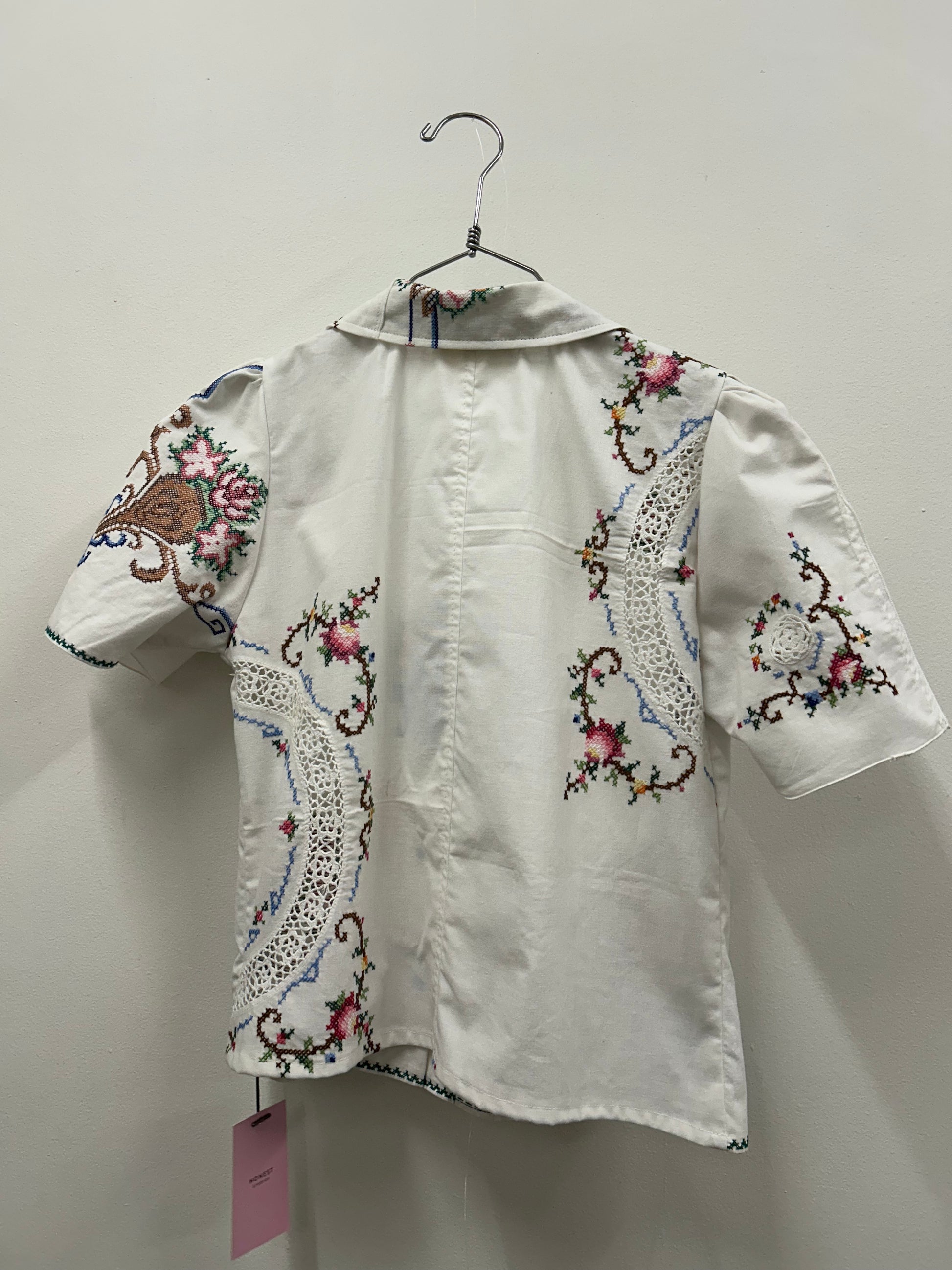 Made from vintage embroidered tablecloths. Each one is a one off. Fastened with snaps down the centre front.