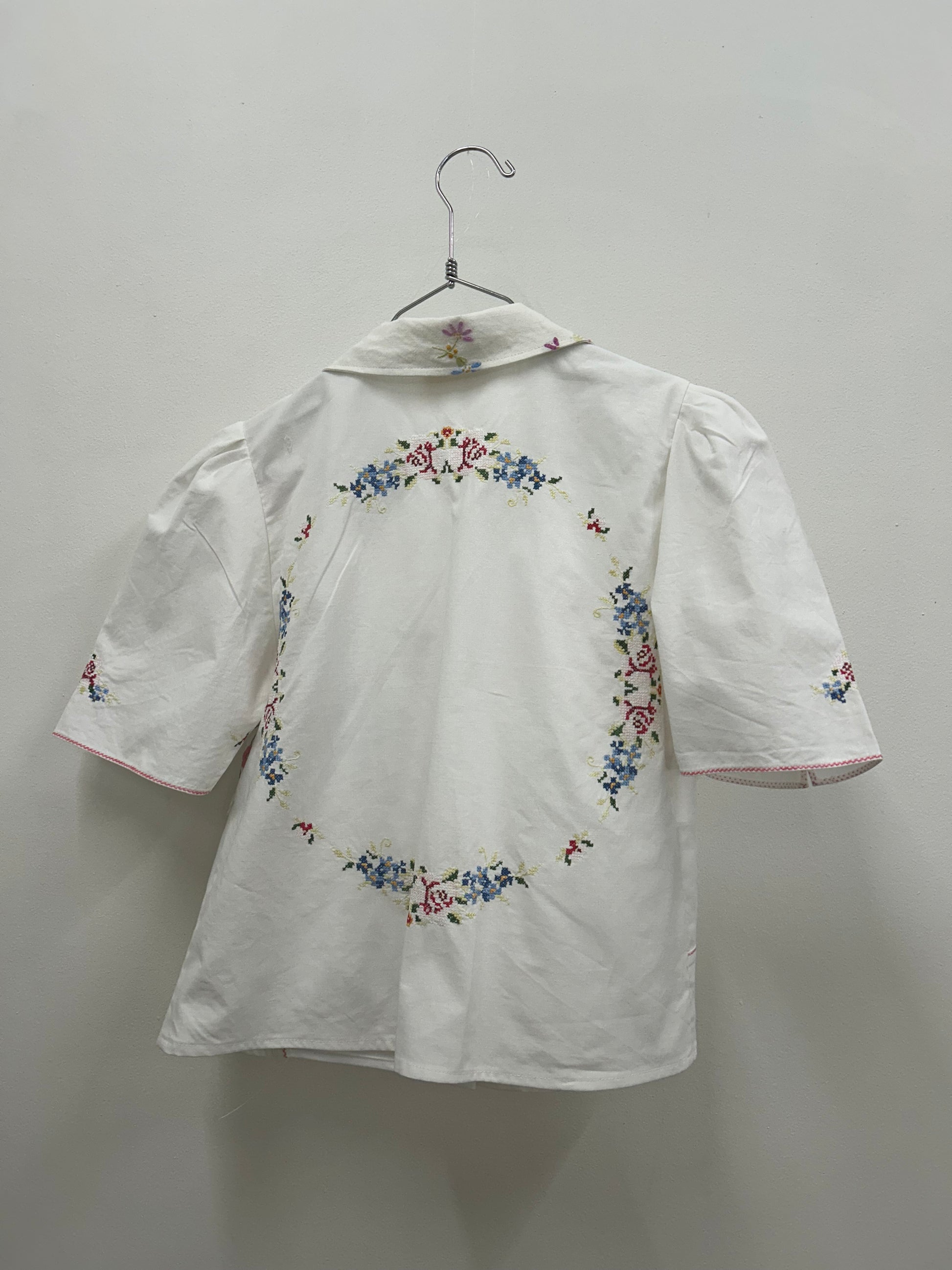 Made from vintage embroidered tablecloths. Each one is a one off. Fastened with snaps down the centre front.