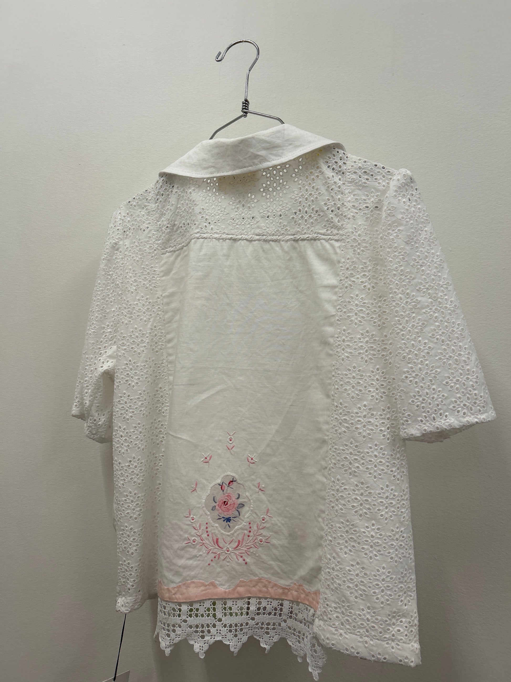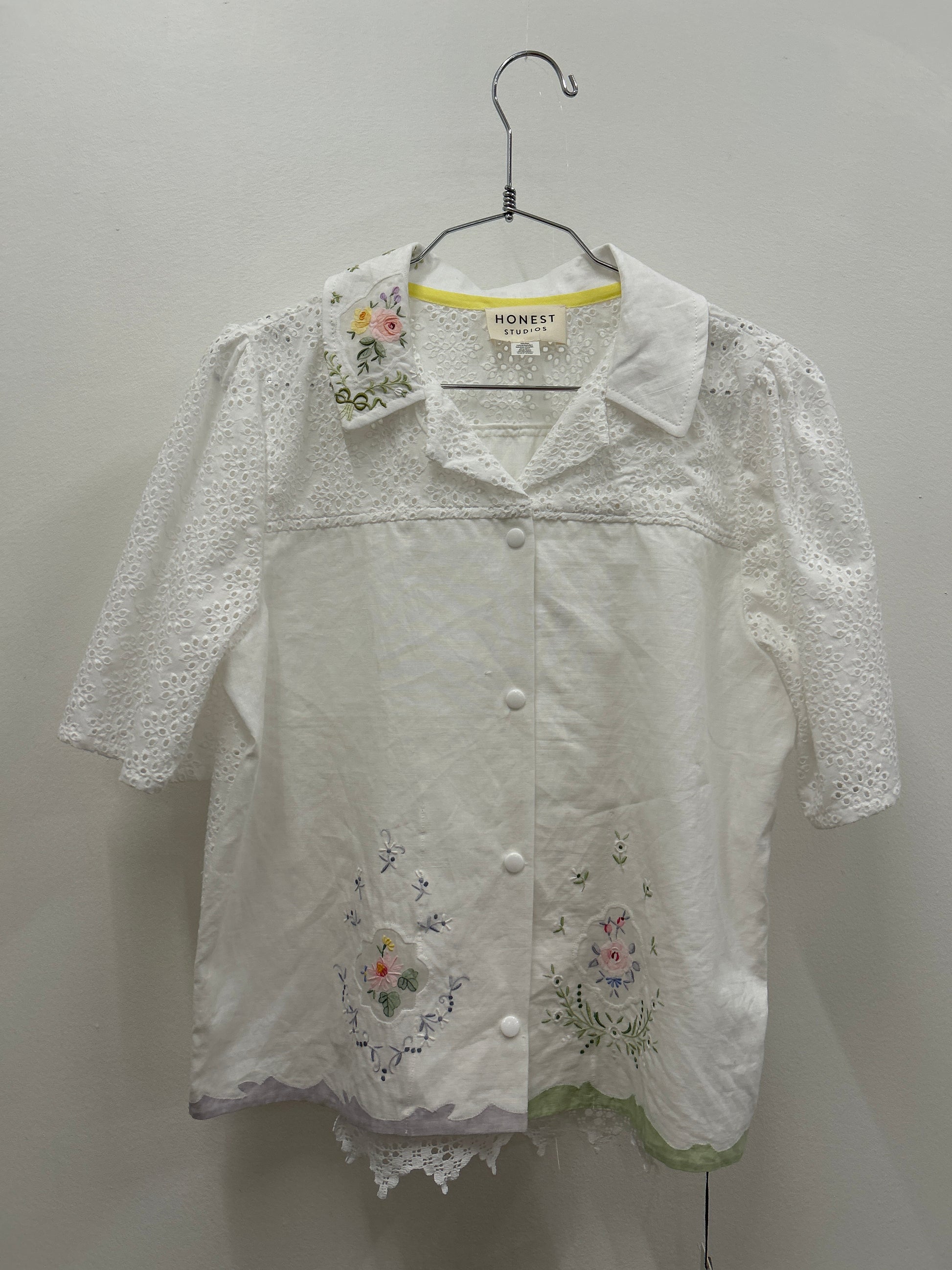 Made from vintage embroidered tablecloths. Each one is a one off. Fastened with snaps down the centre front.