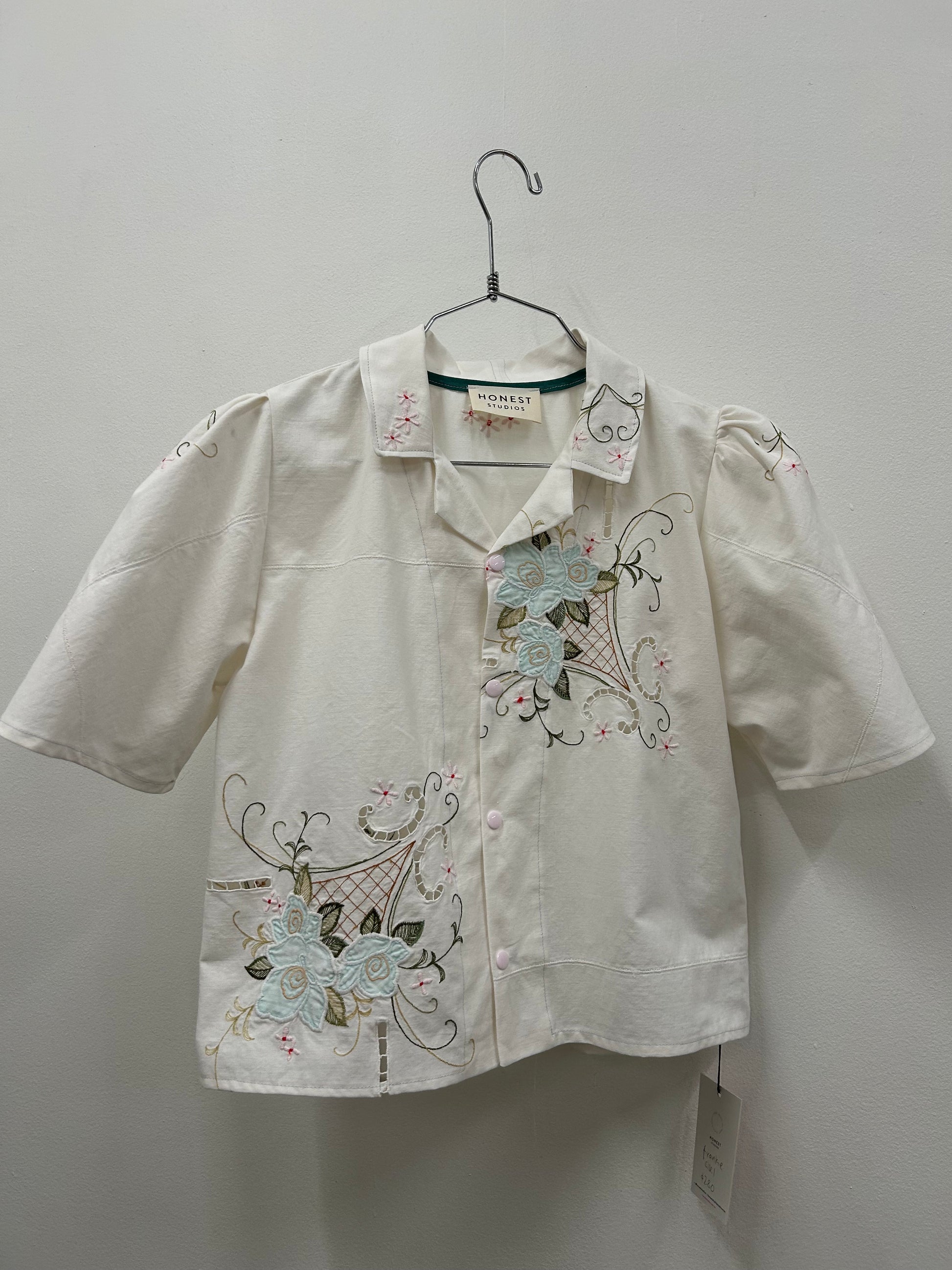 Made from vintage embroidered tablecloths. Each one is a one off. Fastened with snaps down the centre front.