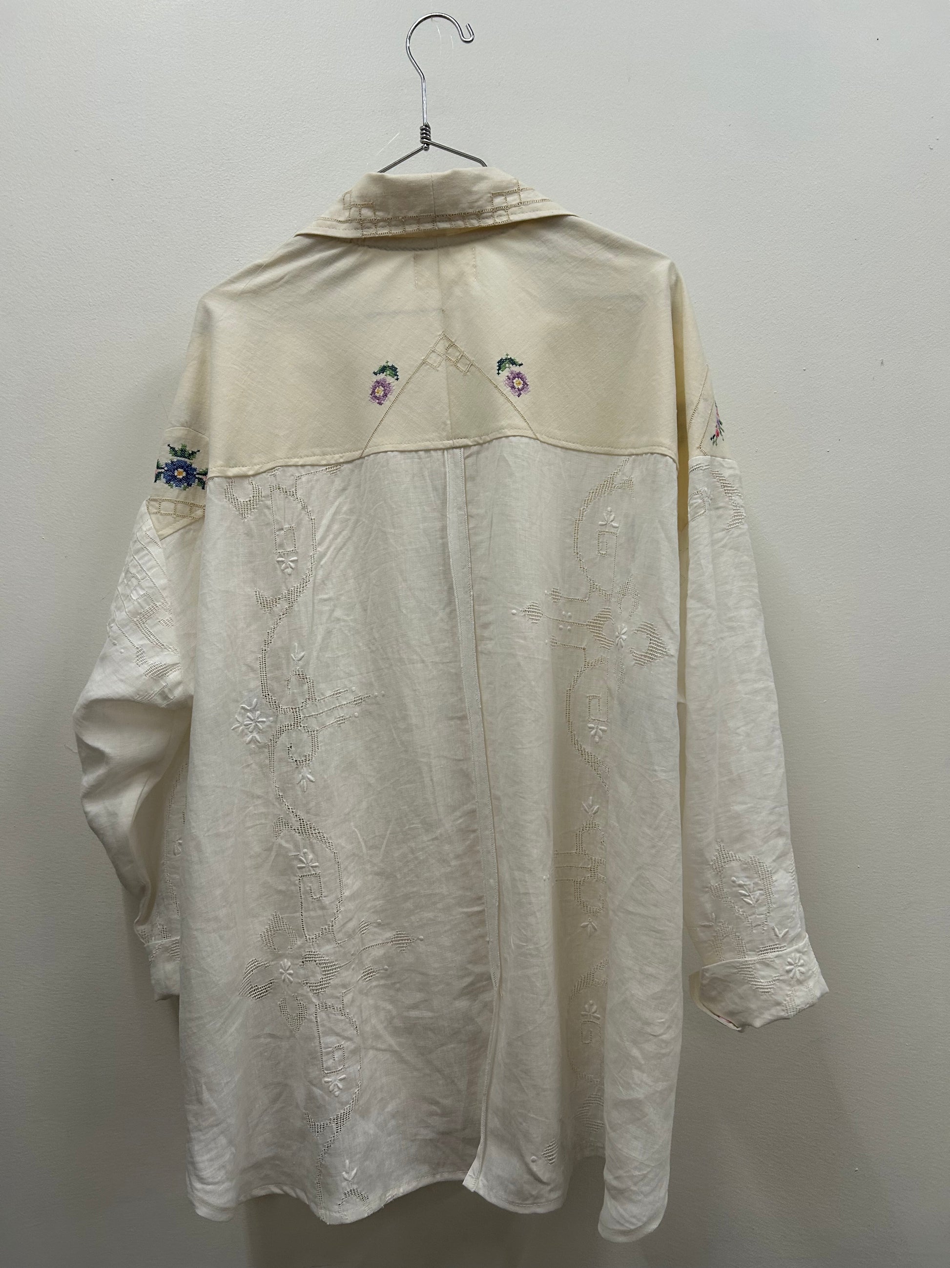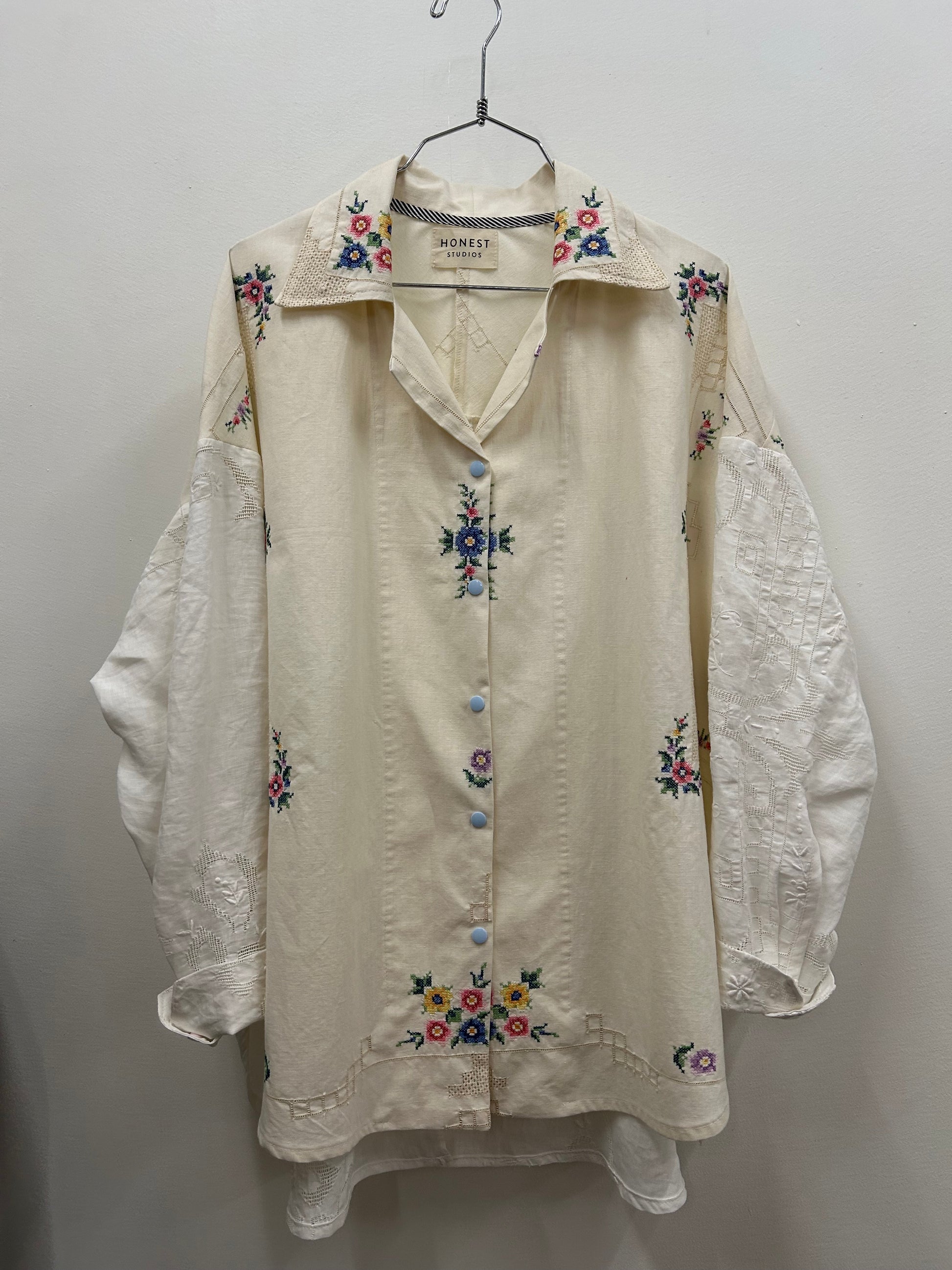 Made from vintage embroidered tablecloths. Each one is a one off. Fastened with snaps down the centre front.