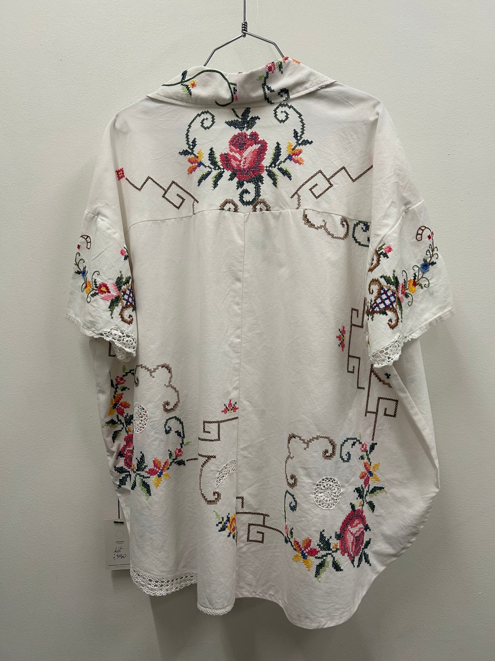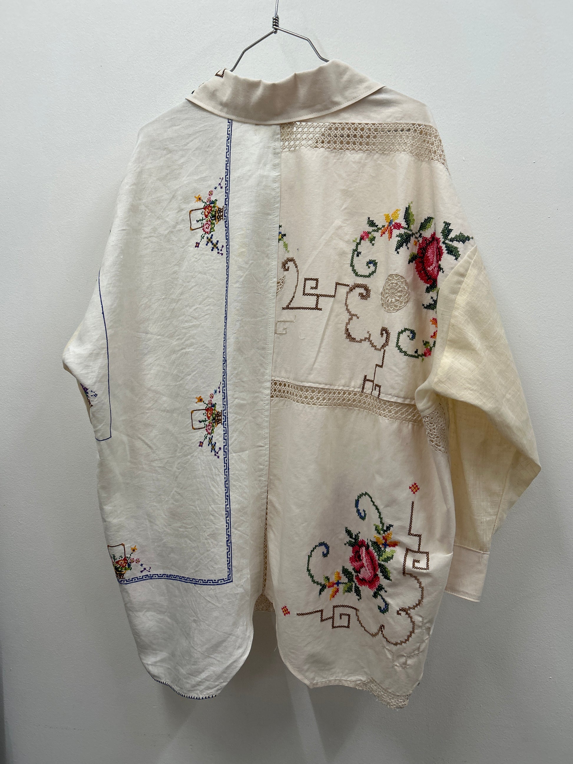 Made from vintage embroidered tablecloths. Each one is a one off. Fastened with snaps down the centre front.